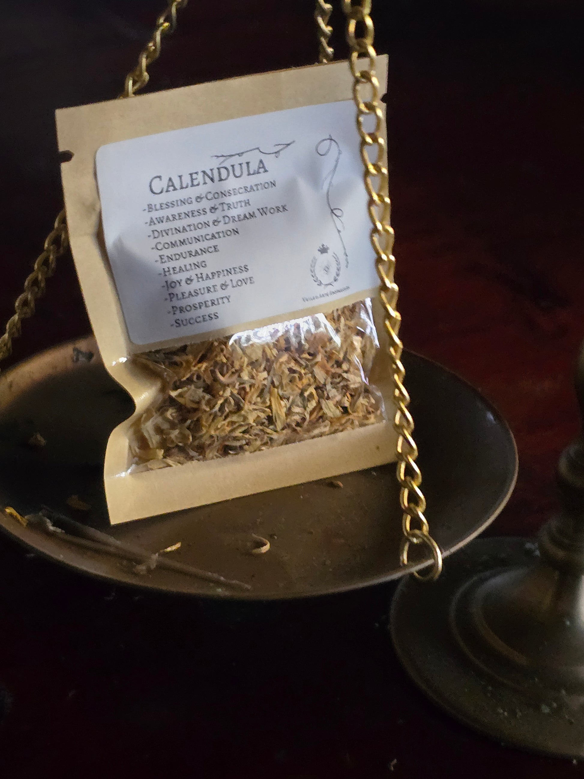 Calendula carries the power of the Sun, radiating protection, confidence, and joy. It is used in spells to strengthen the energetic field, invite prosperity, and illuminate truth. Its golden petals are often added to ritual baths and charm bags to draw success and blessings.