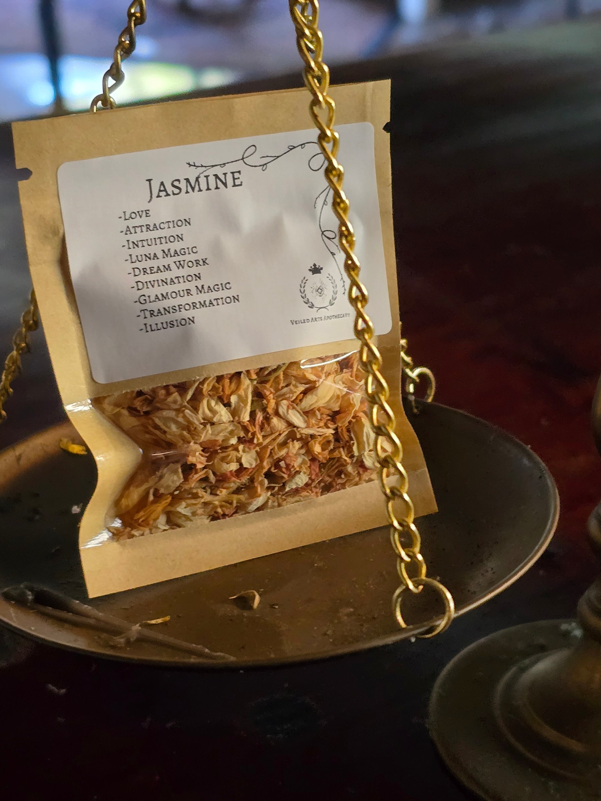 Jasmine is a flower of love, intuition, and lunar magic. It enhances psychic awareness, invites prophetic dreams, and attracts both romantic and spiritual love. The blossoms carry an aura of enchantment that heightens emotional sensitivity and deepens ritual connection.